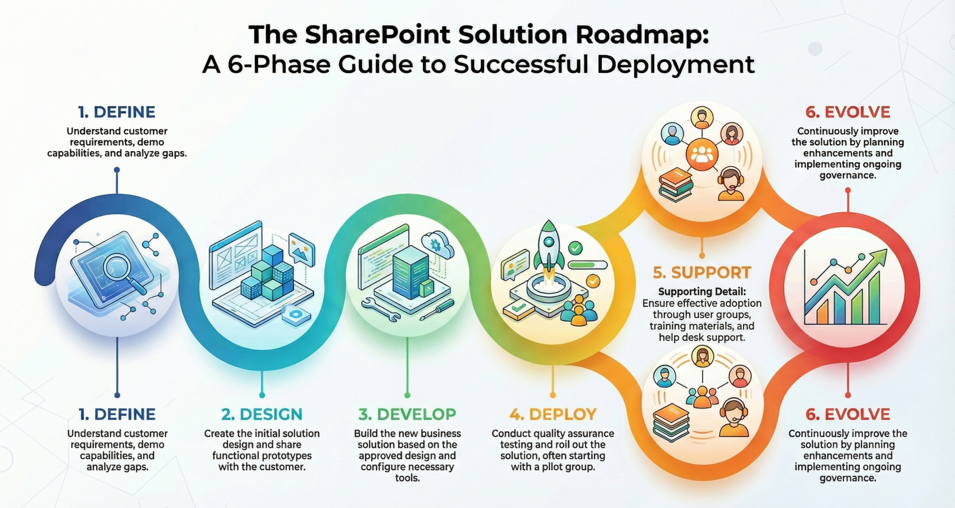 - EVOLVE - To ensure that your new SharePoint business solution gets effectively used by end users and continues to provide value to the organization, you should focus on evolving and improving the technical solution as well as the people-based processes and policies used to manage, support and improve the solution.