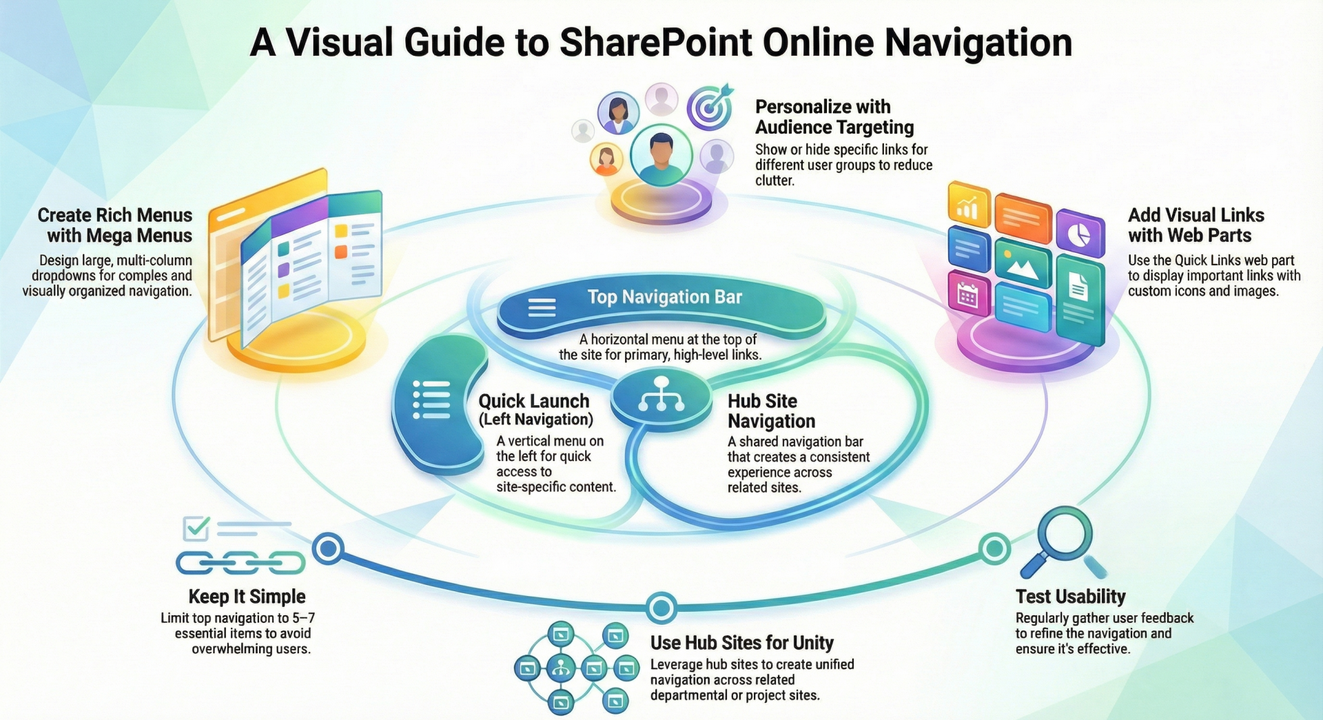 - Keep It Simple: Limit top navigation to 5–7 items and Quick Launch to essential content to avoid overwhelming users.