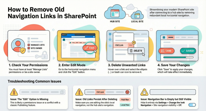 - Ensure you’re editing the site’s local navigation, not the hub site’s navigation (the hub site navigation bar is managed on the hub site itself).