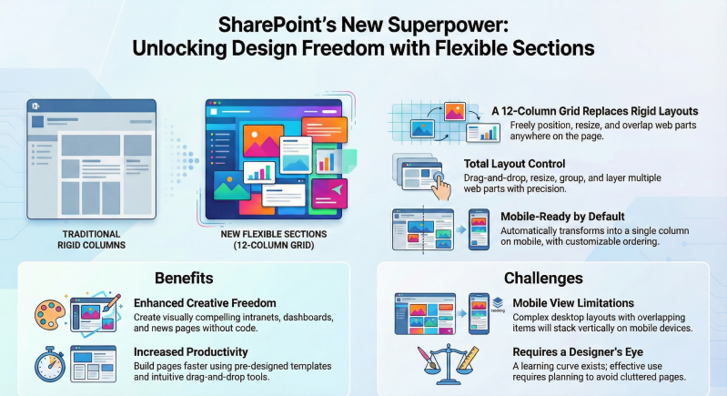 - Flexible Sections replace the fixed column structure with a 12-column grid, allowing web parts to be placed anywhere within the section.