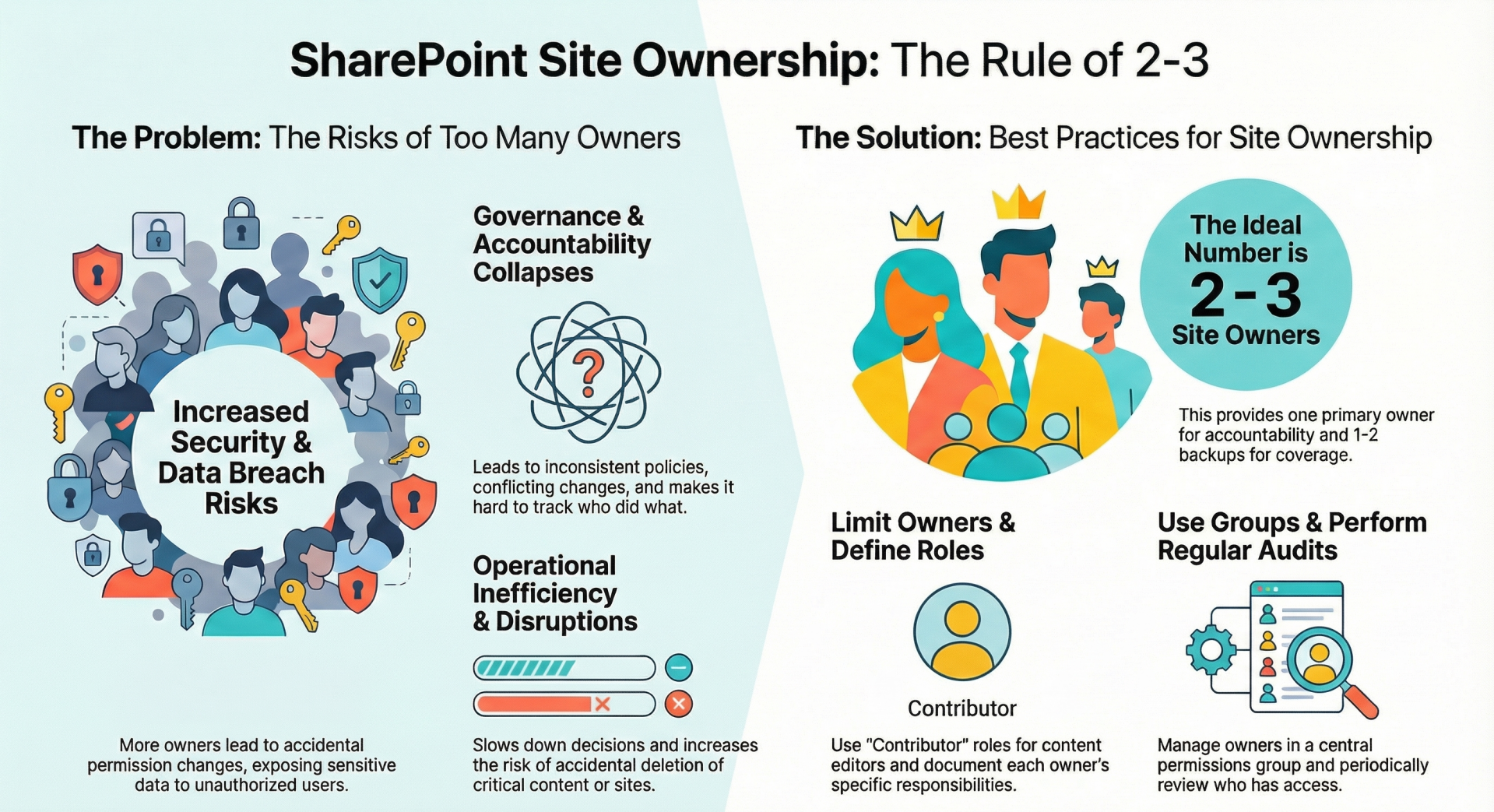 - The optimal number of site owners for a SharePoint site is typically 2-3, balancing administrative needs with security and governance. Having too many owners can lead to security risks, governance challenges, operational inefficiencies, and a poor user experience. By keeping the number of owners minimal, using groups for permissions, and implementing clear governance policies, organizations can maintain secure, efficient, and well-managed SharePoint sites.