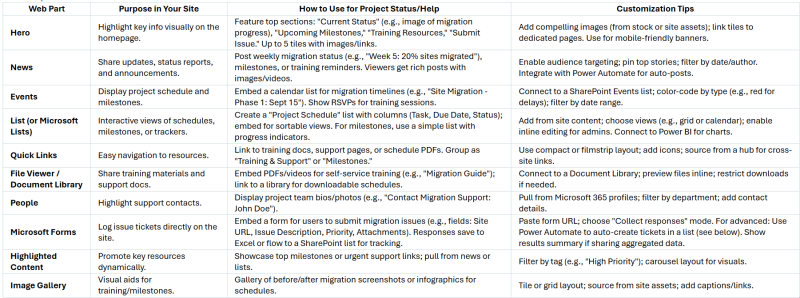 Use these to build intuitive pages. Add them via the + icon while editing a page, searching by name. Customize layouts (e.g., tile vs. carousel) and connect web parts for dynamic filtering (e.g., filter schedule by milestone).