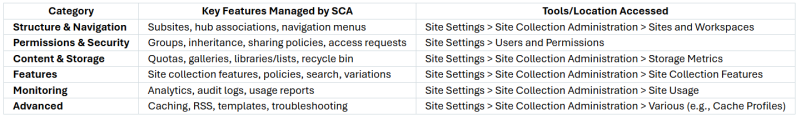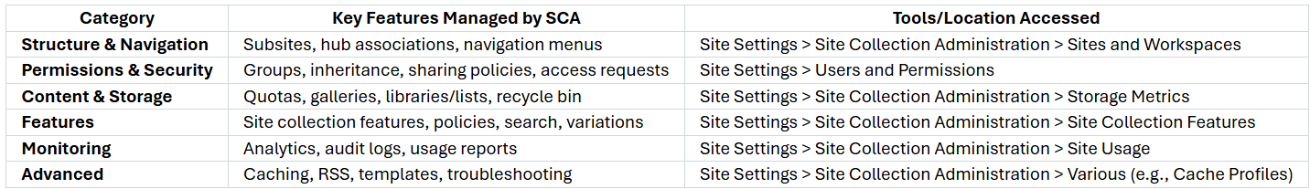 SCAs can access the Site Settings page (under the gear icon > Site settings) and the Site Collection Administration section, which includes advanced tools not available to lower roles. Below is a categorized list of key features SCAs can configure and manage: