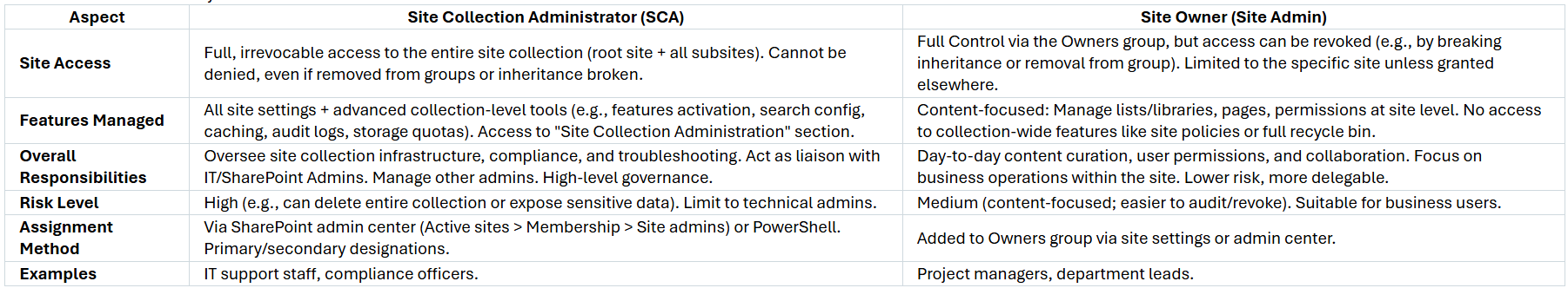 Key Takeaway: SCAs are "super admins" for the site collection, handling technical and policy aspects beyond content. Site Owners are empowered for operational tasks but lack the "god-mode" access of SCAs.