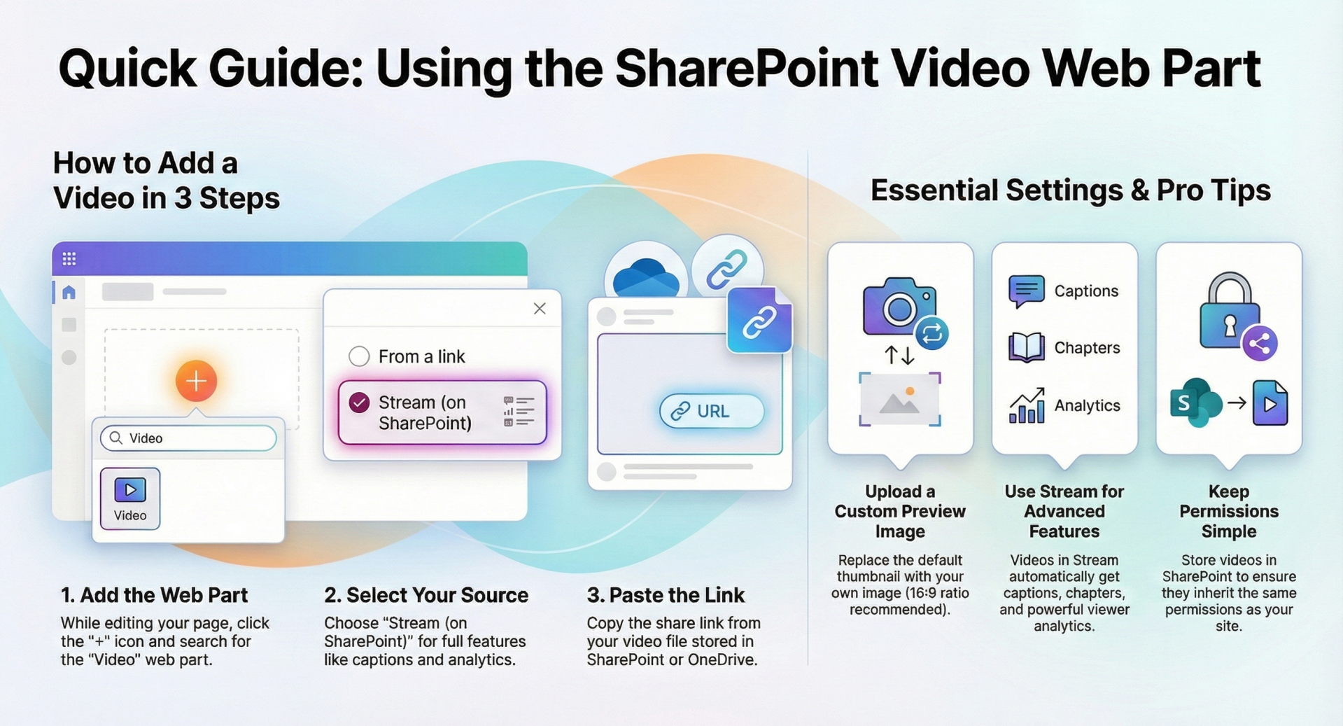 This guide gives site owners and editors a complete, concise reference for embedding and managing videos in SharePoint Online.
