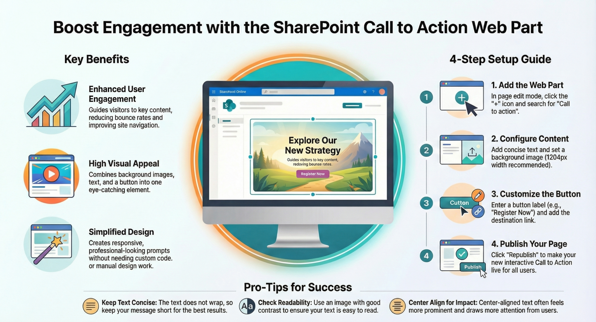 The Call To Action (CTA) Web Part in SharePoint Online is a versatile tool designed for modern pages, allowing you to create visually engaging prompts that encourage users to interact with your content. Unlike basic buttons, it combines a clickable button with contextual text and a background image, making it ideal for driving engagement without cluttering the page.