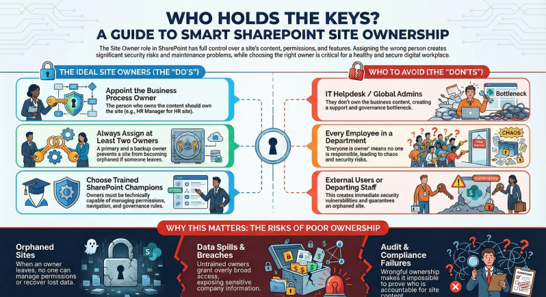 In SharePoint Online, the Site Owner role carries full control over the site and has significant responsibilities and risks. Choosing the right person (or people) as a Site Owner is critical for governance, security, and long-term maintainability.