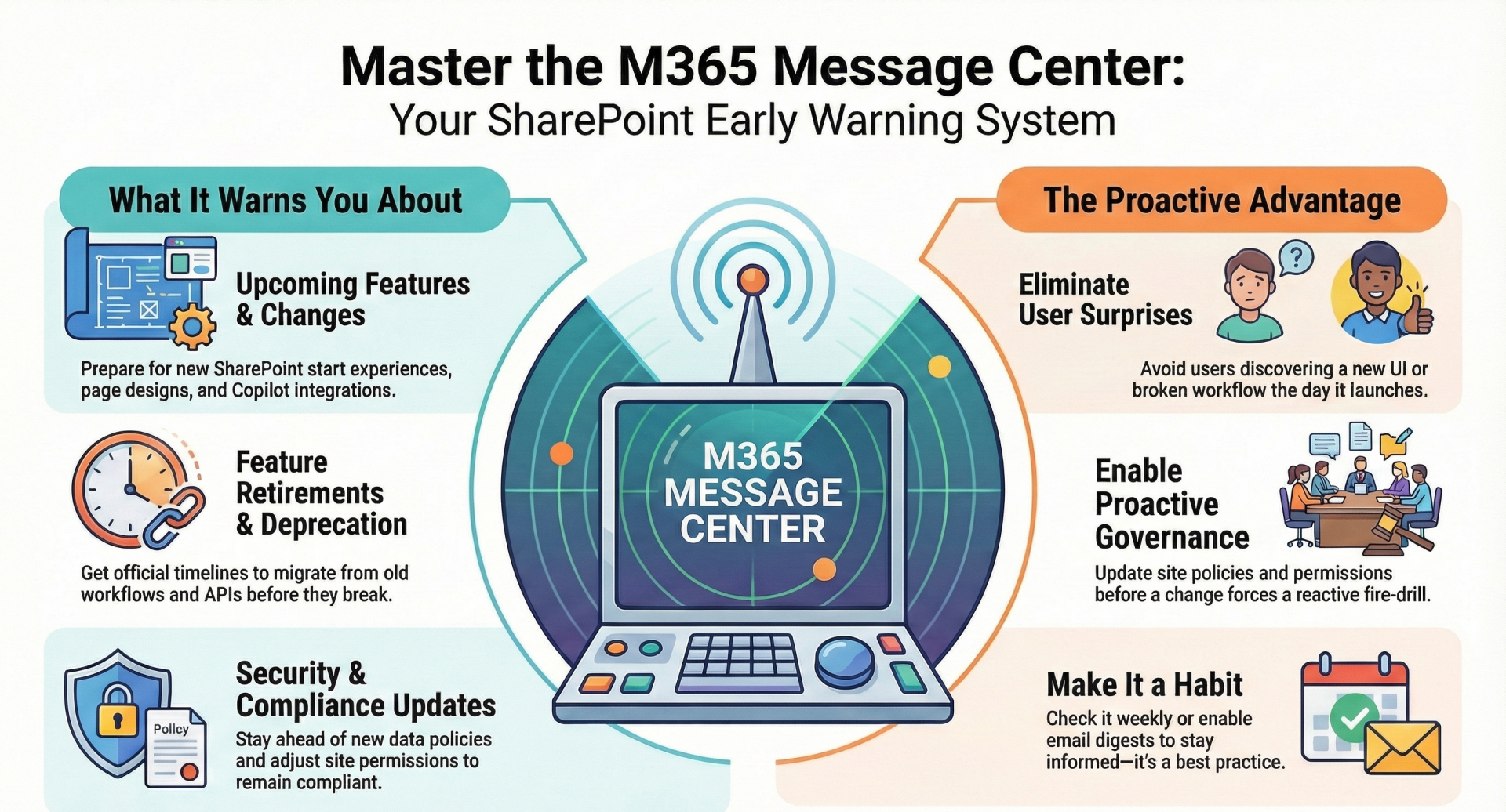 | Area of Impact | What the Message Center Provides | Why It Matters for SharePoint |