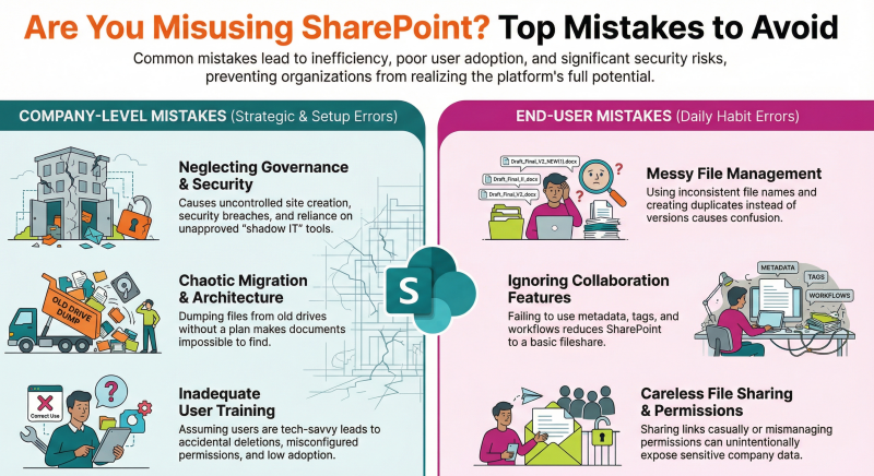 SharePoint, Microsoft's collaboration and document management platform, is widely used in organizations for intranets, team sites, and file sharing. However, both companies (including IT administrators and decision-makers) and end users often misuse it, leading to inefficiencies, security risks, poor adoption, and compliance issues. This document outlines common wrong ways SharePoint is used, drawing from expert insights and best practices. By highlighting these missteps, organizations can avoid them to maximize SharePoint's potential.