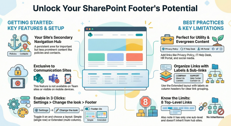 Introduced as part of modern SharePoint enhancements, the footer helps create a professional, website-like experience. It supports branding consistency, quick access to policies or contacts, and improved user wayfinding without cluttering the main navigation.