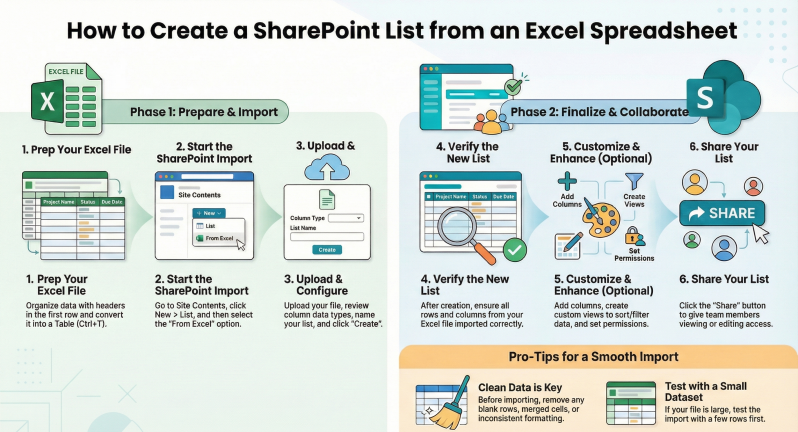 Step-by-step instructions for creating a SharePoint list using data from an existing Excel spreadsheet.