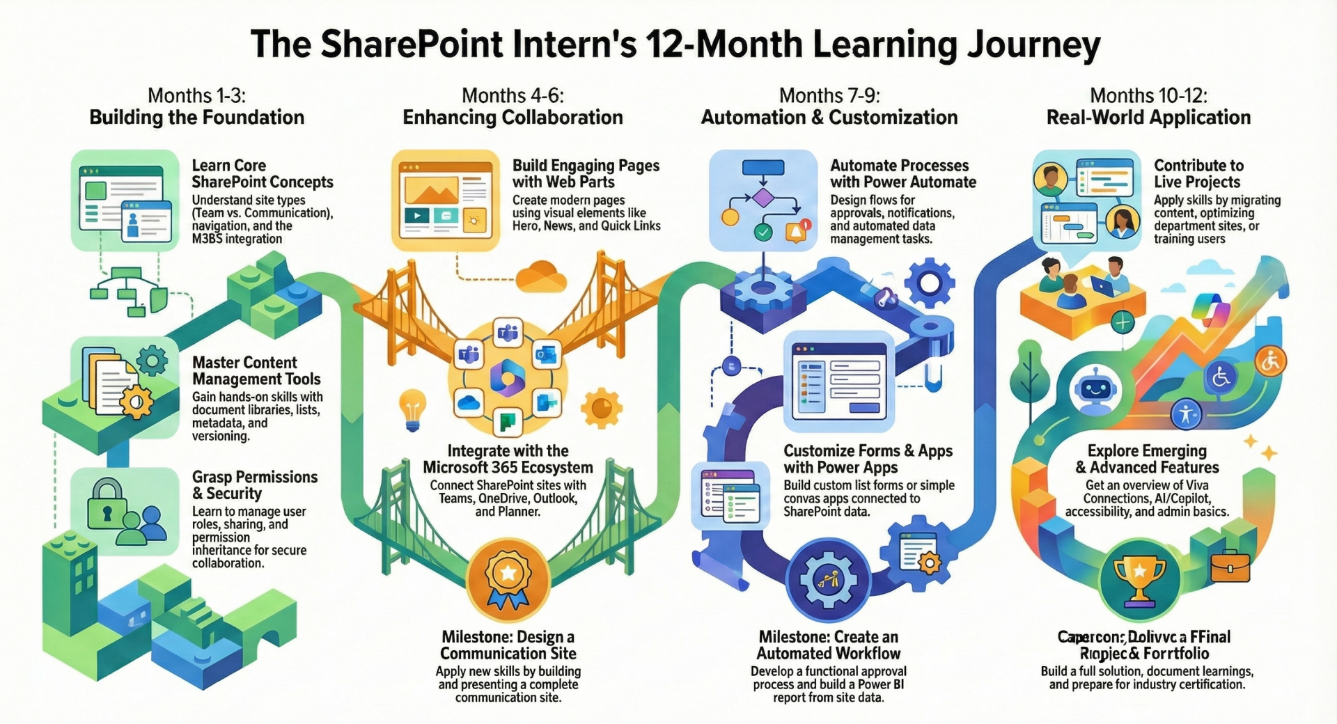 - If the intern shows interest in development, introduce no-code/low-code extensions or basic SPFx for web parts (requires Node.js basics).