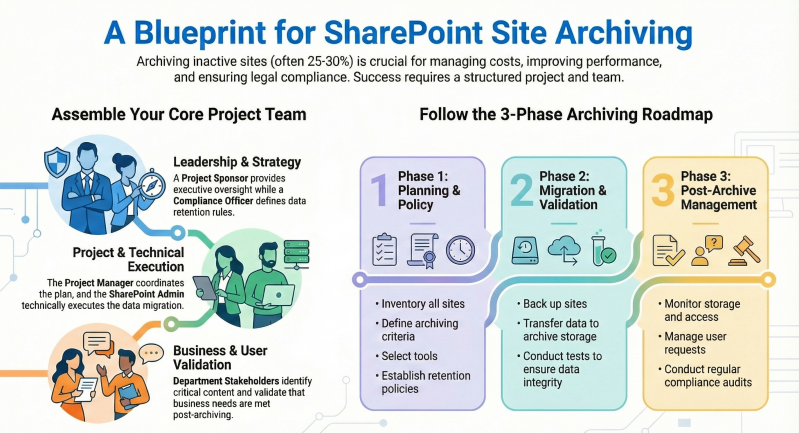 By involving these roles with clearly defined responsibilities, the organization can ensure a structured, compliant, and efficient SharePoint archiving project that meets both technical and business needs.