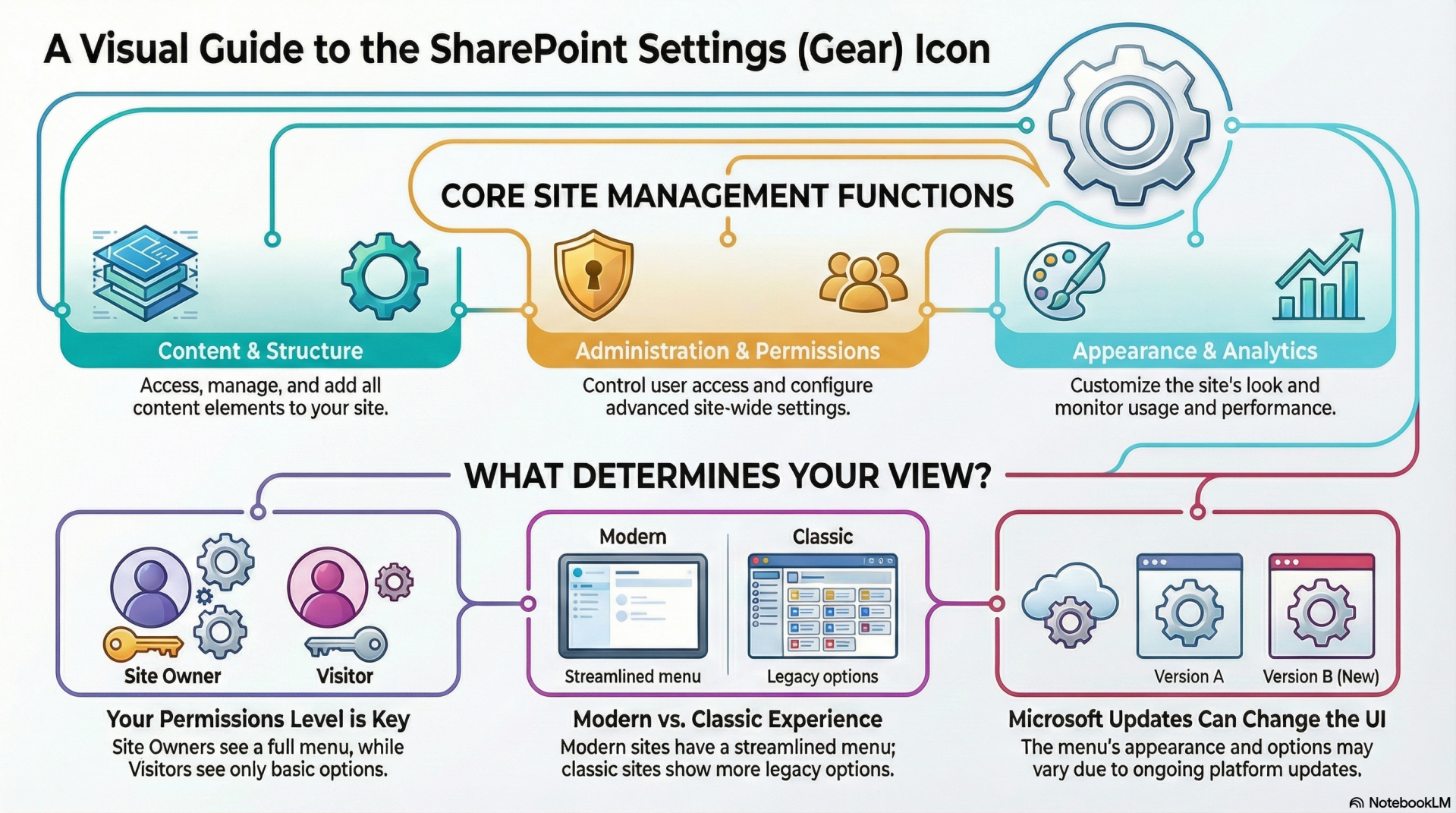 - UI Variations: The gear menu’s appearance and options may vary due to Microsoft’s ongoing updates to SharePoint Online. For example, changes to the suite bar or tenant-wide theming can alter the menu’s look or available options.