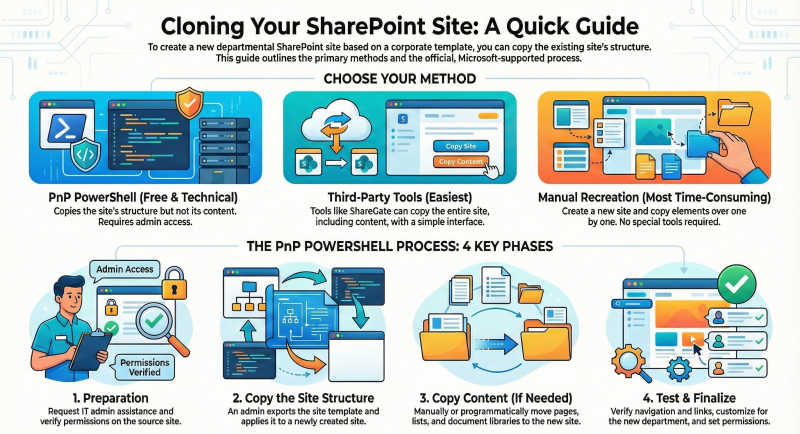 There are a few primary methods, ranging from free (but more technical) to paid (easier for full copies). The most official and cost-free approach recommended by Microsoft is using PnP PowerShell, which exports a site template and applies it to a new site. Third-party tools can handle more complete copies, including content, but may require licensing.