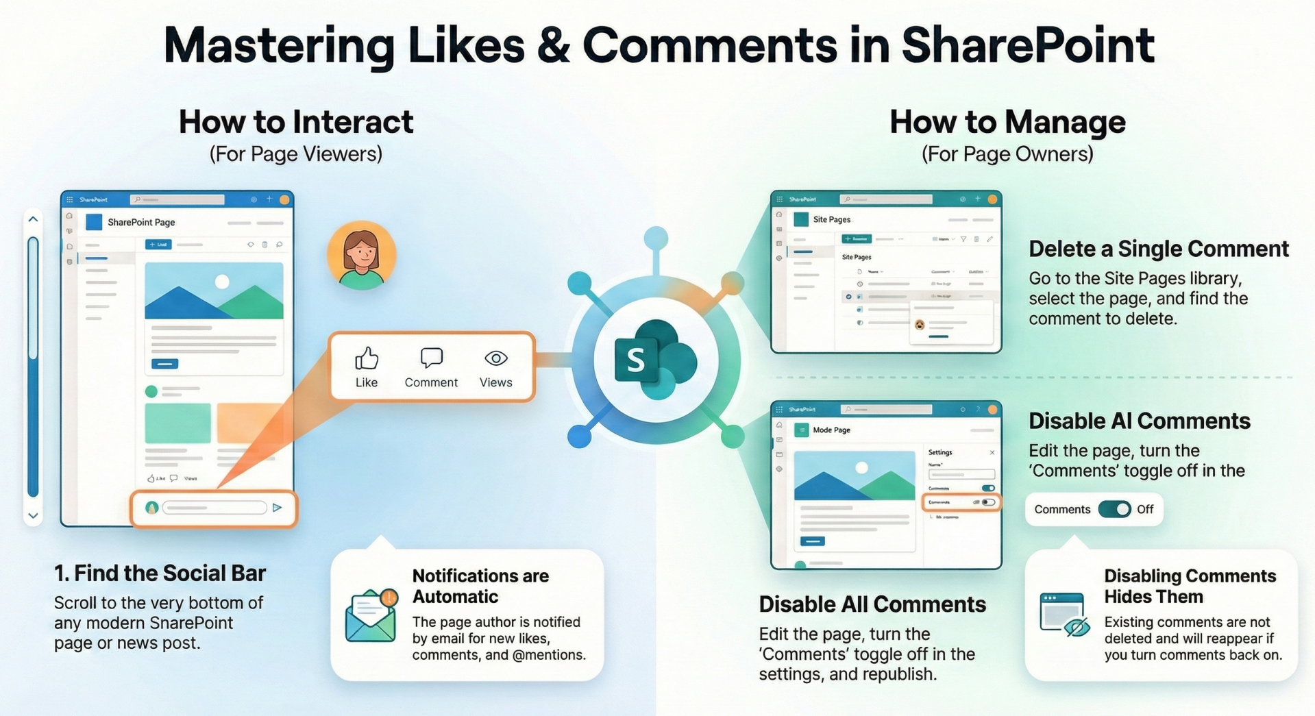 - Note: Comments must be enabled on the page for this section to appear. Users need at least Read permissions to view the page and interact (like/comment). Notifications are sent via email to the page author for new likes, comments, or @mentions