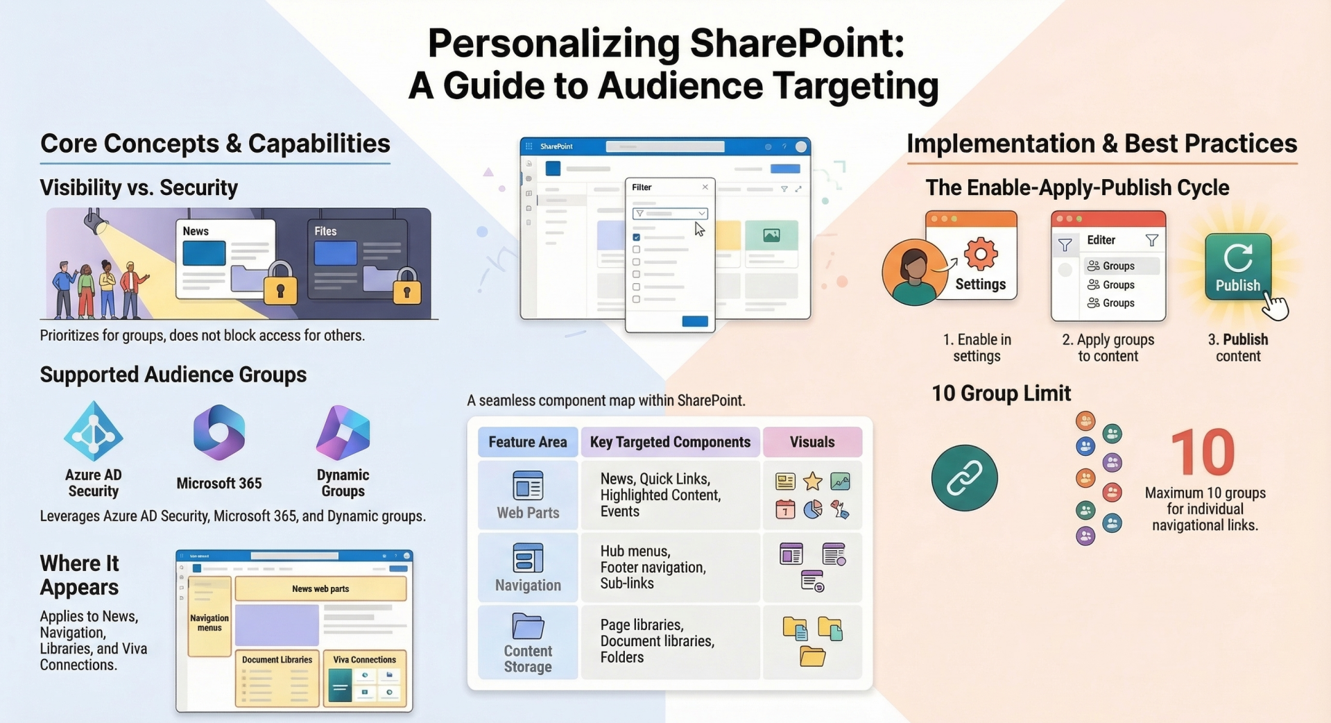 Audience targeting is applicable in several areas of SharePoint Online to enhance content delivery:
