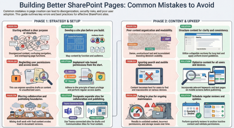 SharePoint serves as a robust platform for collaboration and content management within organizations. However, errors in the creation, population, and publication of pages can lead to inefficiencies, security vulnerabilities, and reduced user adoption. Based on established best practices, the following outlines the most prevalent mistakes, accompanied by descriptions and recommended avoidance measures.