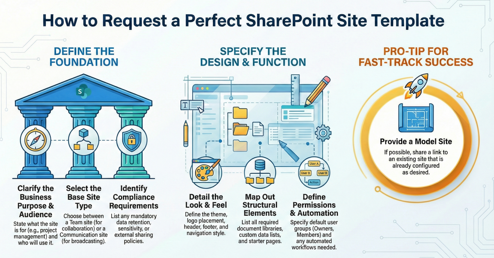Following this checklist significantly increases the likelihood of timely approval and successful implementation, while reducing back-and-forth communication. Most organizations that maintain strong SharePoint governance require a completed version of a form containing these elements before beginning technical development of a custom site template.