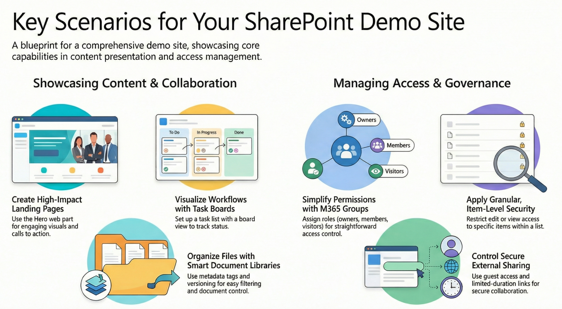 To effectively showcase the capabilities of SharePoint Online in creating visually appealing pages, organizing and displaying content in lists and libraries, and managing site permissions, consider incorporating the following scenarios. These are scenarios are organized into categories for clarity, with each scenario including a brief description of its purpose, key features demonstrated, and potential implementation notes.