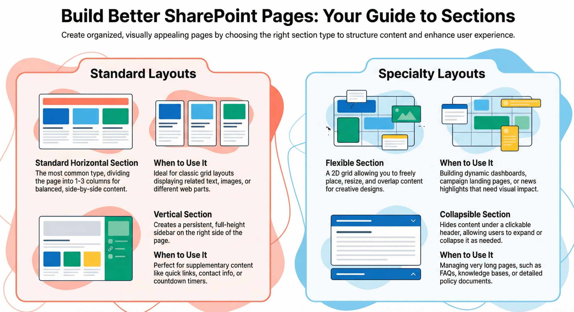 - SharePoint Online offers several section types, each suited to different organizational needs. Understanding these helps in choosing the right one for your page layout.