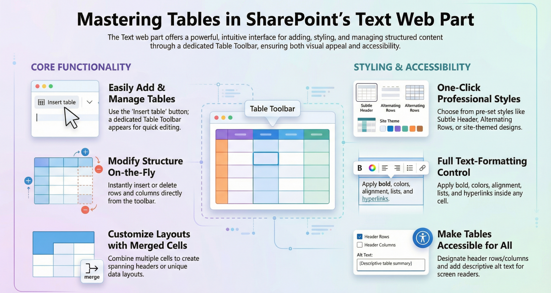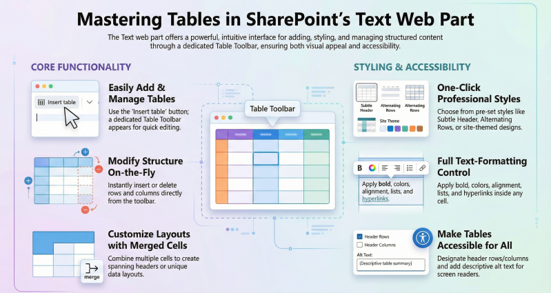 This article provides a comprehensive overview of all feature options for tables within the Text web part, based on the latest available functionalities as of January 2026. Key enhancements in recent years include improved accessibility (introduced around 2023-2025) and the dedicated Table Toolbar (rolled out in early 2025), which consolidates and expands table management tools. These features build on the core table capabilities, ensuring better usability, responsiveness, and inclusivity.