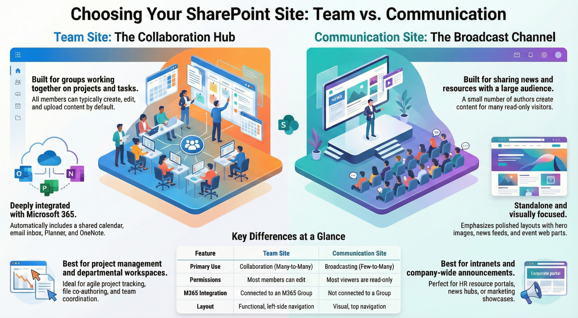 - Communication Sites: Better for high-traffic viewing, with performance tuned for rendering rich content. Scales well for enterprise-wide use without collaboration overhead.