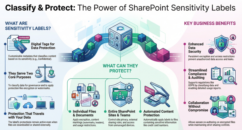 - Enhanced Data Protection: Persistent encryption and restrictions prevent unauthorized access, even outside SharePoint (e.g., downloaded files).