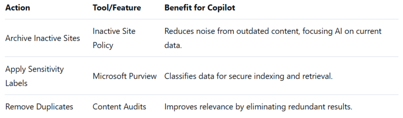 - Effective content preparation focuses on quality, organization, and lifecycle management to help AI tools like Copilot generate relevant responses. Poorly structured or outdated content can lead to irrelevant or inaccurate outputs.