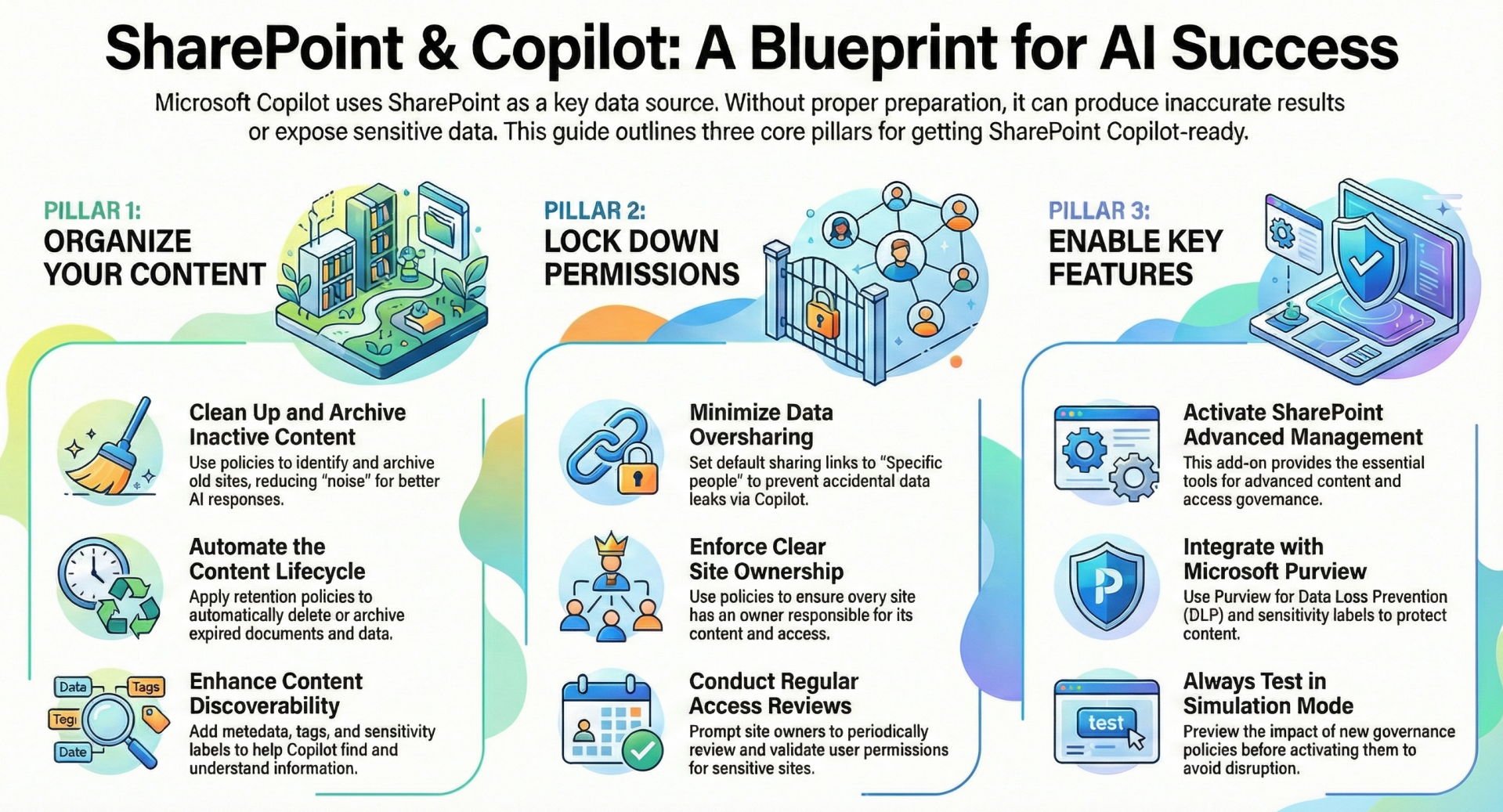 This article outlines actionable steps across content, permissions, and features, drawing from best practices to optimize SharePoint for AI-driven tools.