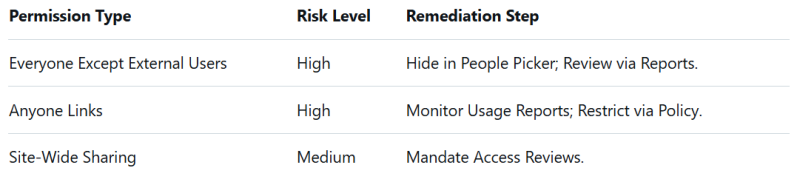 - Monitor Sharing: Run reports like Oversharing Baseline Report via PowerShell and Site Permissions for the Organization to detect broad permissions (e.g., "Everyone Except External Users"). Use AI insights in reports for remediation suggestions.