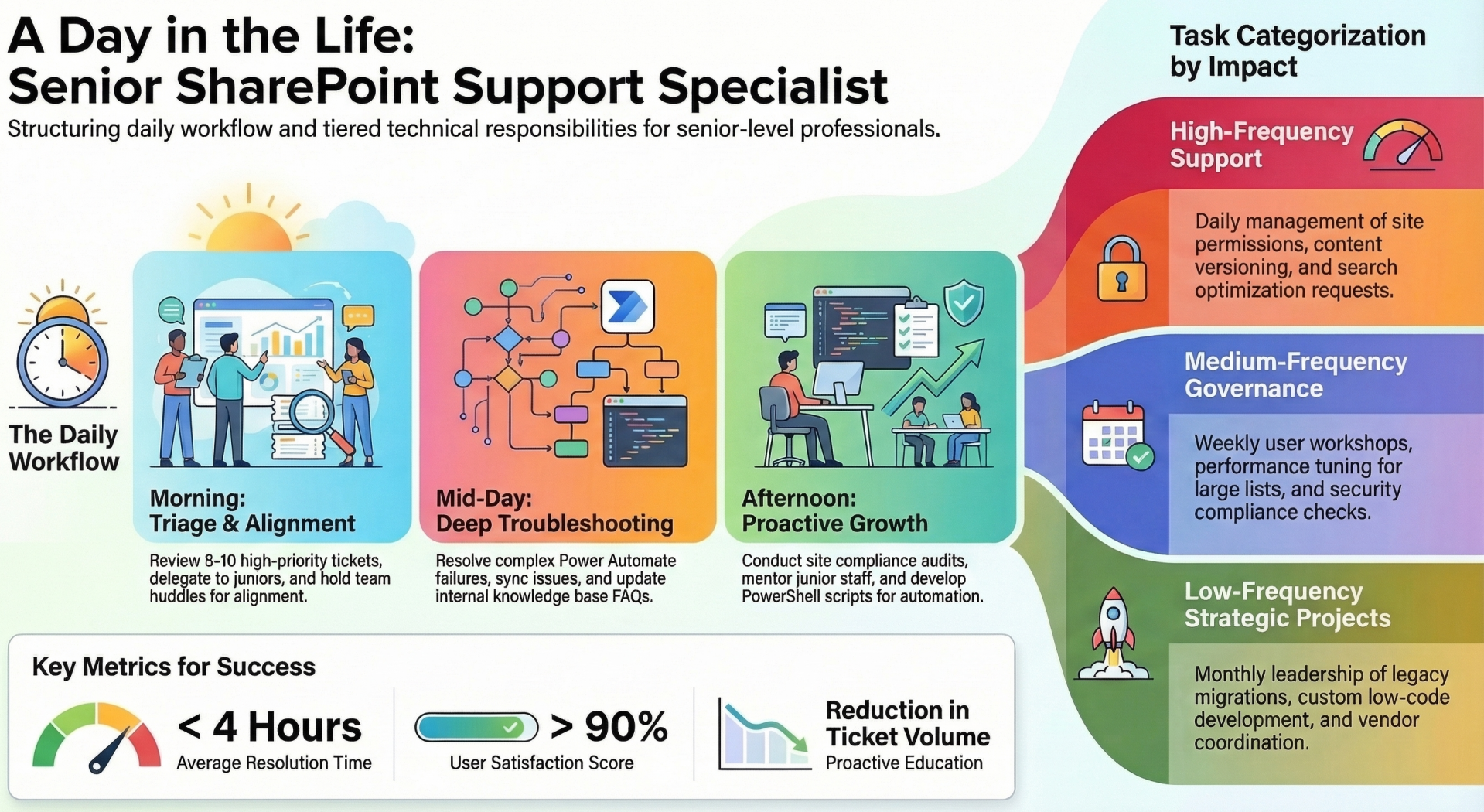 - Unlike entry-level support, senior positions emphasize strategic problem-solving, user education, and cross-functional collaboration. This article outlines your daily responsibilities, key tasks, team interfacing, and best practices to help you hit the ground running. This outline is based on standard practices in enterprise environments using SharePoint Online. Expect a mix of reactive support (e.g., ticket resolution) and proactive initiatives (e.g., training sessions).