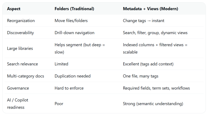 This approach aligns with modern SharePoint best practices, emphasizing metadata, views, content types, and flatter structures for better discoverability, search, governance, scalability, and AI readiness.