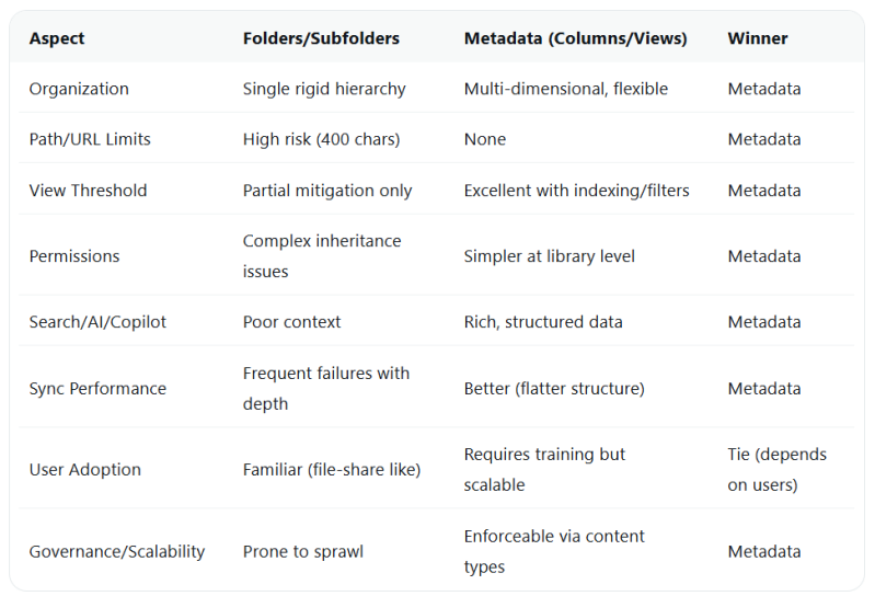 - Copilot and AI: Relies heavily on metadata for reasoning; folder names provide minimal context, leading to poor results (e.g., missed documents in folder-only libraries).