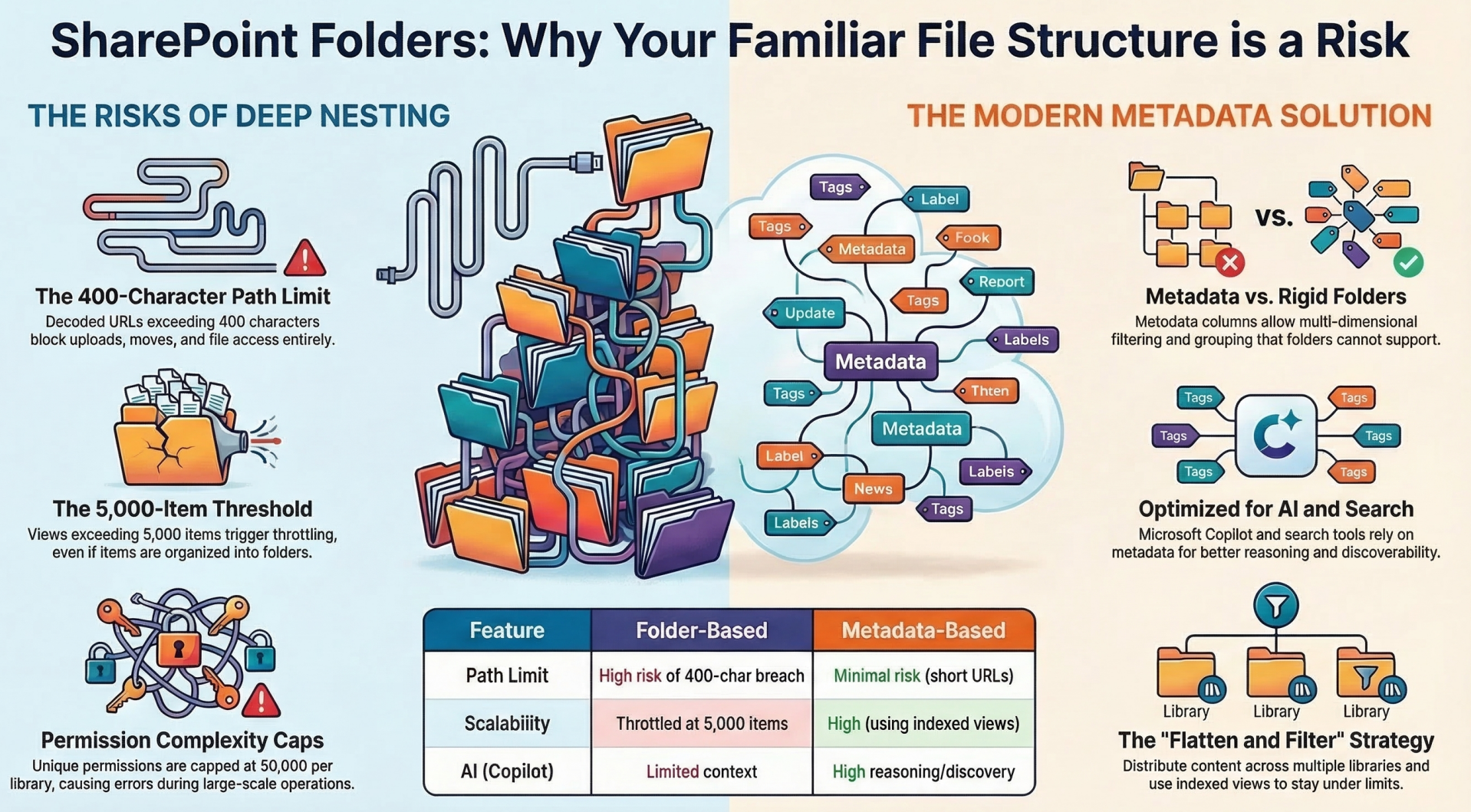 Official Microsoft guidance highlights these as performance and usability trade-offs. Deep nesting exacerbates issues, especially in modern experiences, Teams-integrated libraries, and AI-assisted search. The following sections break down the risks category by category.