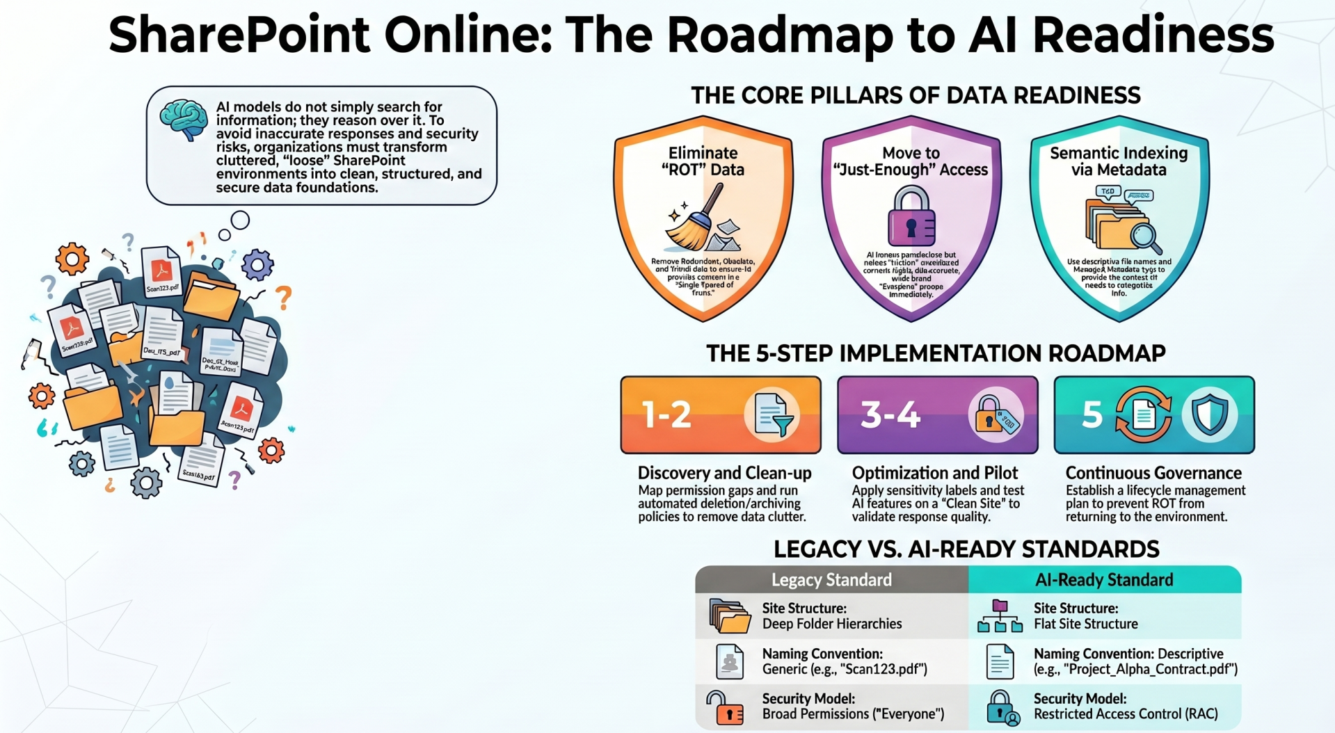 The successful deployment of Microsoft AI solutions, such as Microsoft 365 Copilot, within a SharePoint Online (SPO) environment is directly dependent on the quality, structure, and security of the underlying data. AI models do not just "search" for information; they "reason" over it. Therefore, an environment cluttered with outdated information or characterized by loose permissions will inevitably lead to inaccurate AI responses and potential security risks.